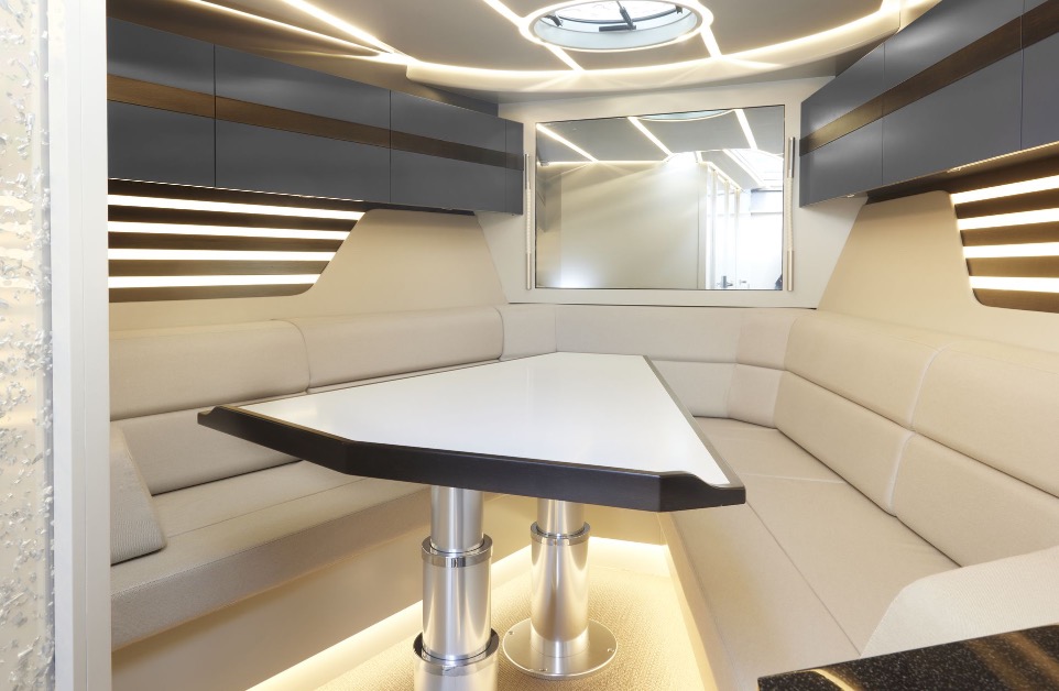 State of the art finishes and special Cantalupi lighting grace the Q52's interior. Integrated kitchen appliances streamline the space, and a glass partition elevates the shower and electric toilet with a touch of magic.